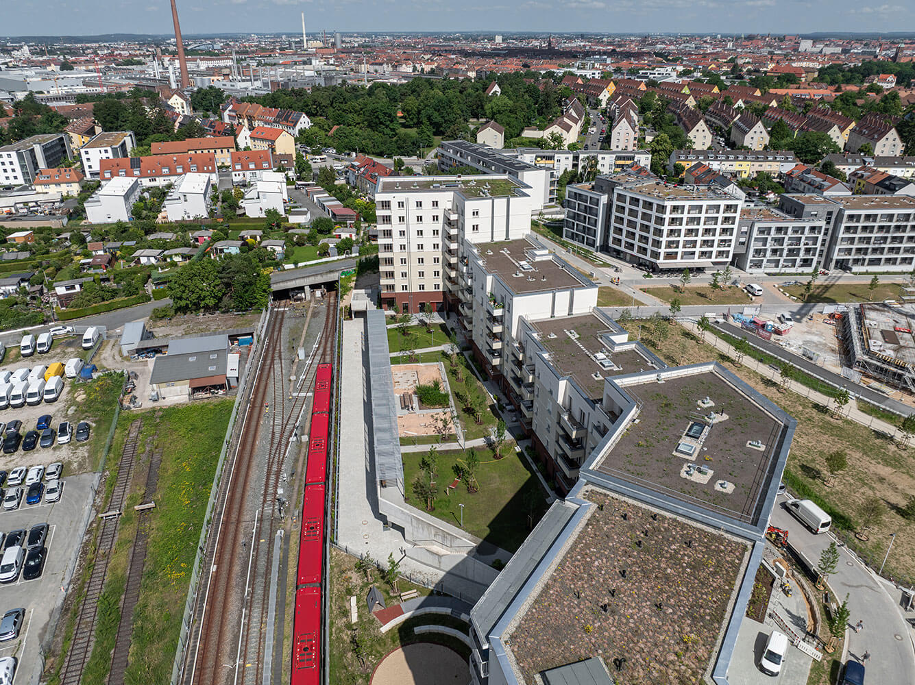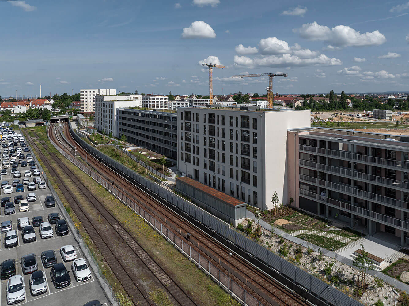 The new Lichtenreuth district in Nuremberg is being built on a 90-hectare site that was formerly occupied by the Südbahnhof railway station. At 583 metres, the project is considered Europe's longest residential construction site. However, the building land was not entirely inactive brownfield site. This is because part of the development was realised along the U1 underground line. The high-traffic location places high demands on the vibration and sound insulation of the new buildings.